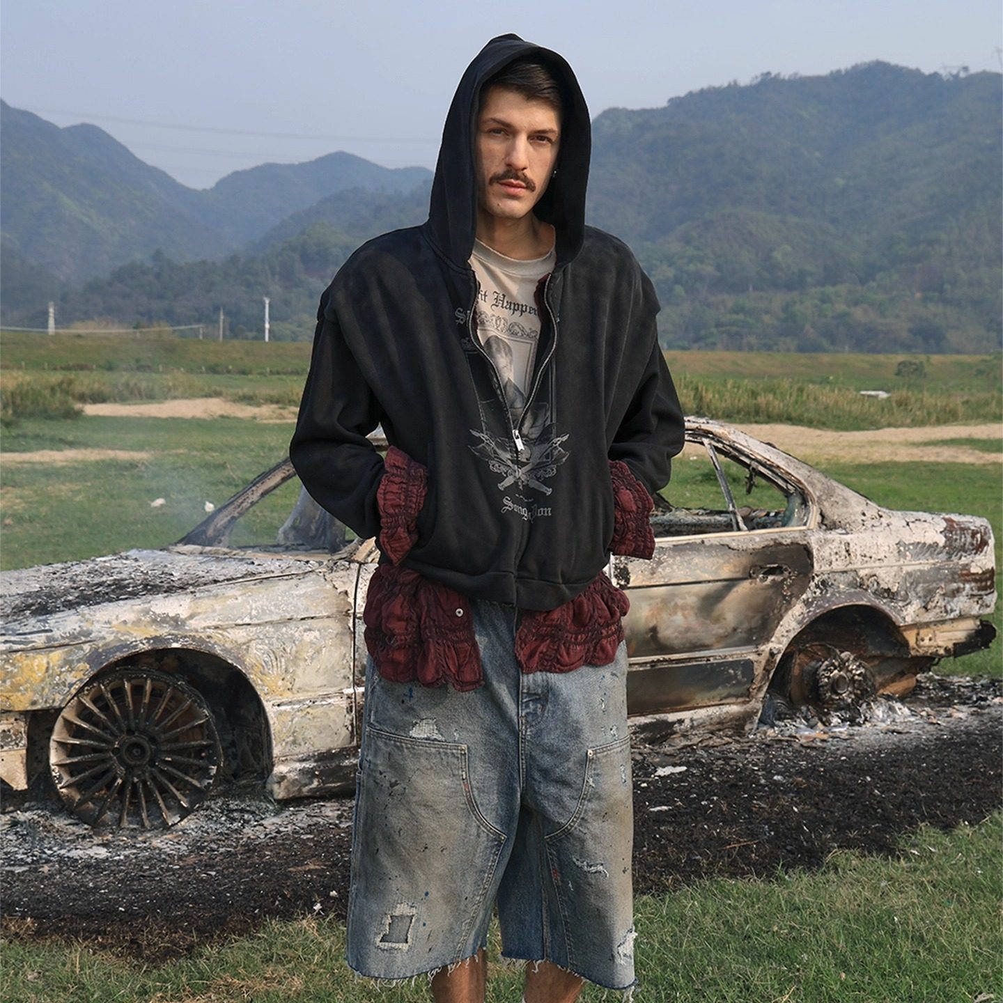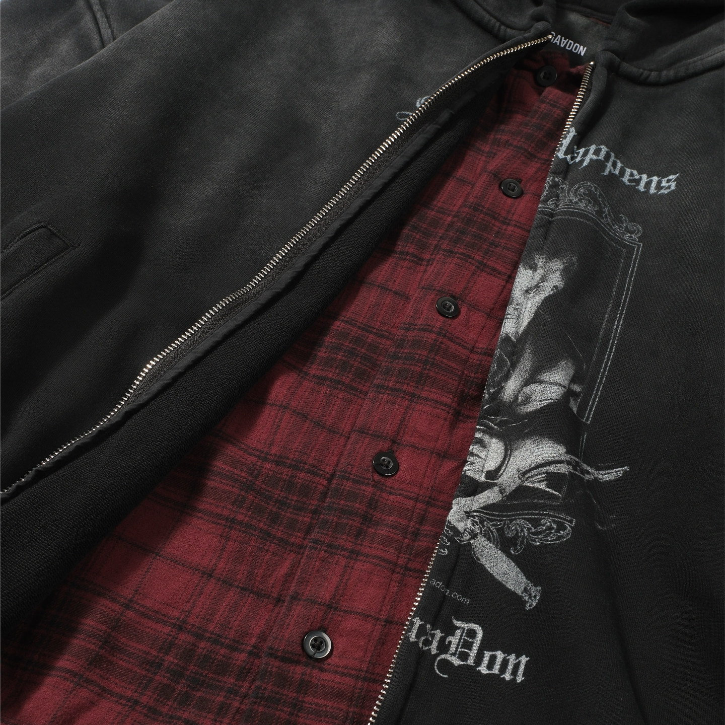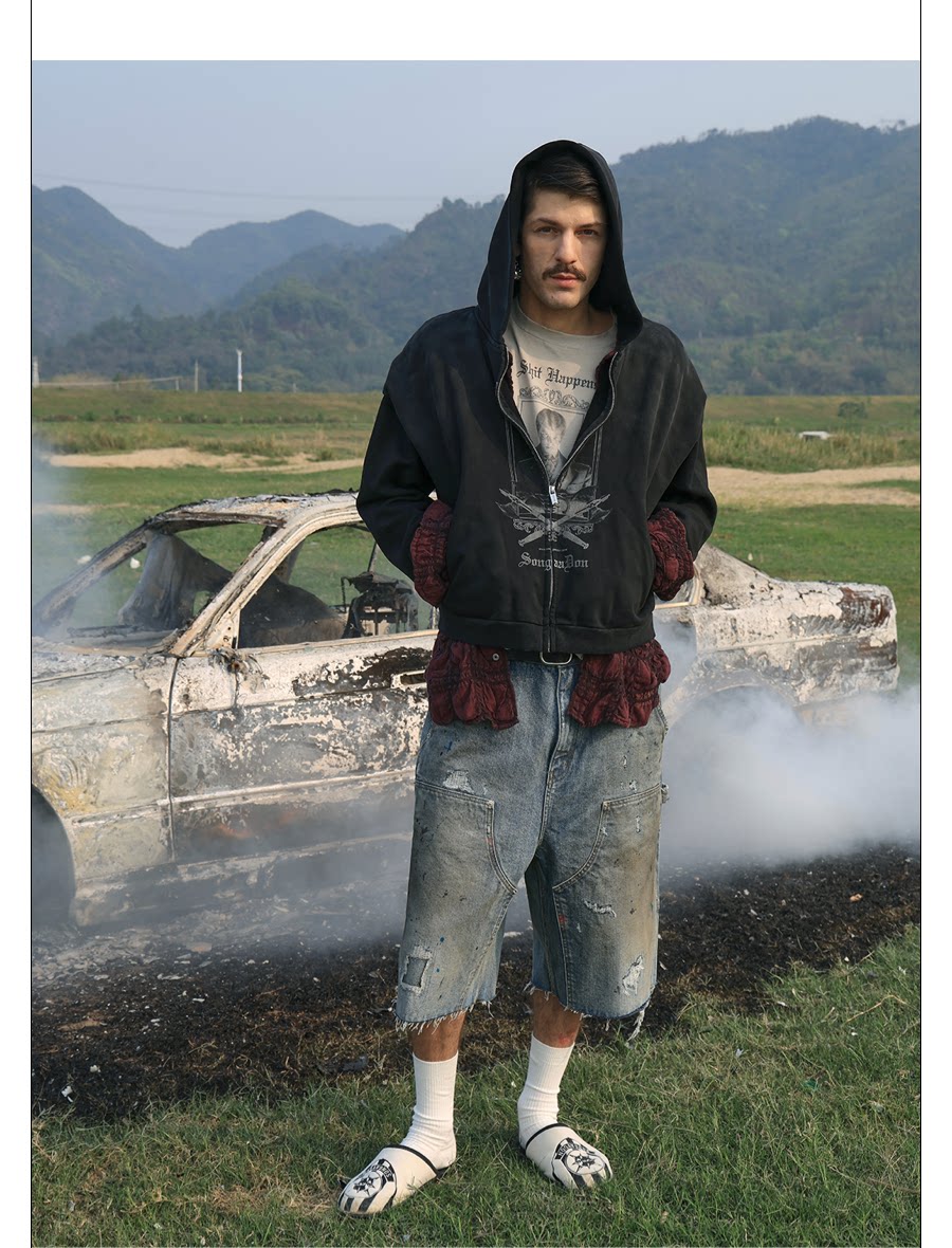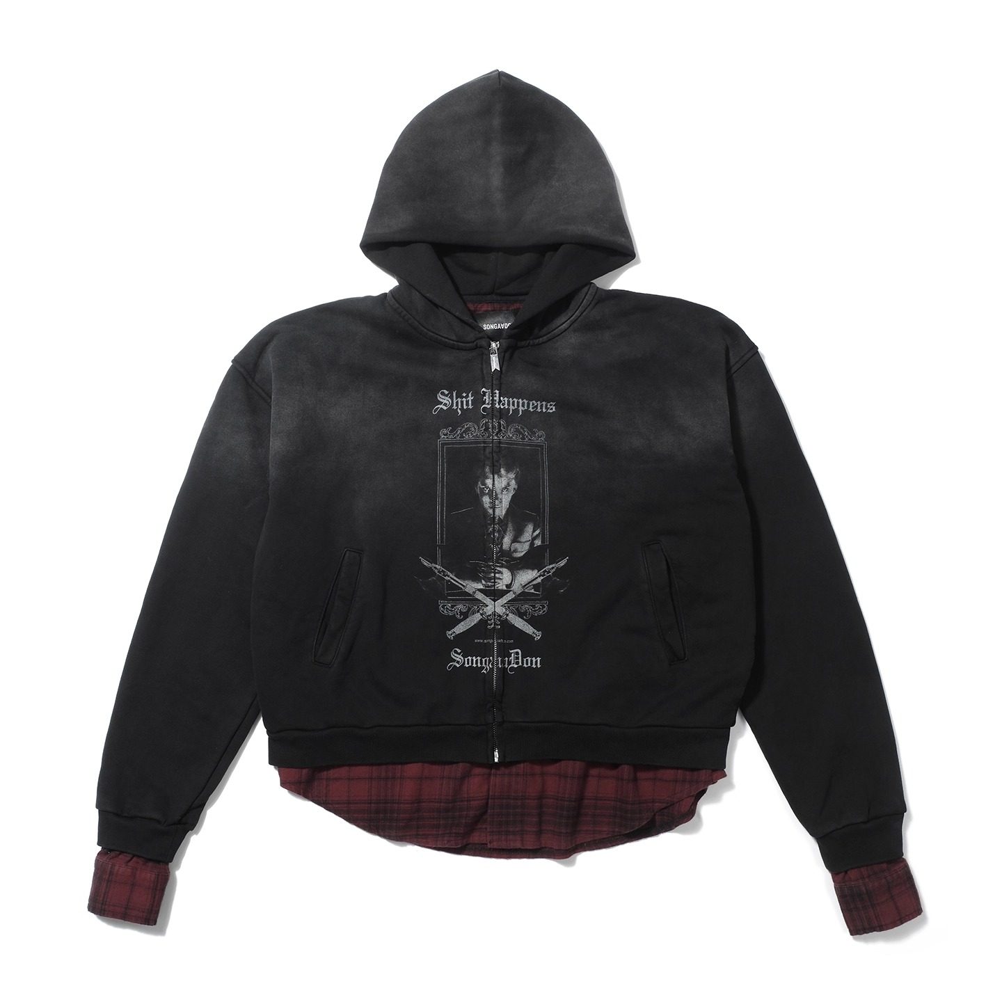 SONGAADON 25FW Double Fabric Fake Two Piece Washed Print Hoodie