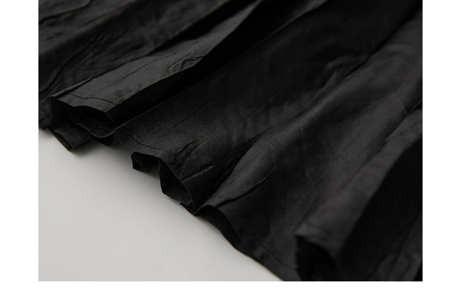 Details : Forged in shadow, this skirt is a sacred vestment of dark romance. Its knife-sharp pleats fall like a cathedral's ribbed vault, a architectural ode to the sublime. Heavier than midnight, it sways with a solemn, funereal grace. This is not mere clothing—it is armor for moonlit rituals, a tapestry of woven melancholy for the sepulchral bride and nocturnal poet alike.