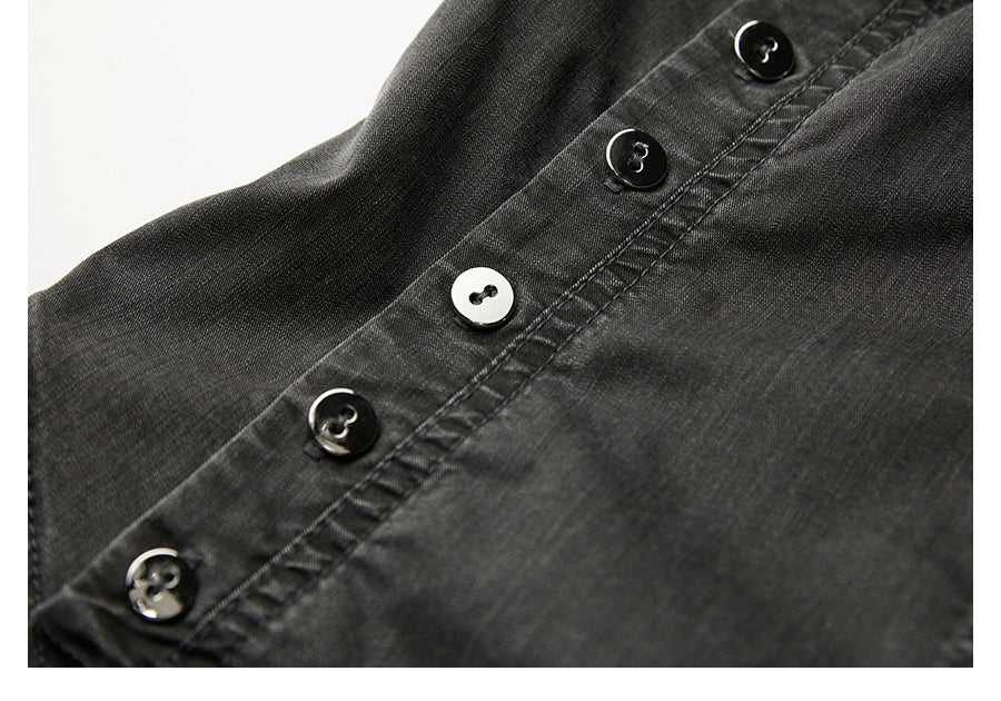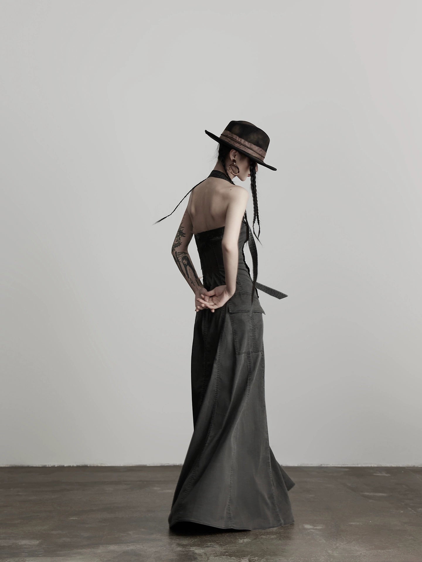 Details : This somke grey dress is like reanimated twilight. Tencel flows with the luster of spectral silk, while polyester outlines a sharp, draped silhouette. The spandex clings like a second skin, enveloping the form as a walking scar. It is silence refined by moonlight—the tangible embodiment of a modern elegy.
